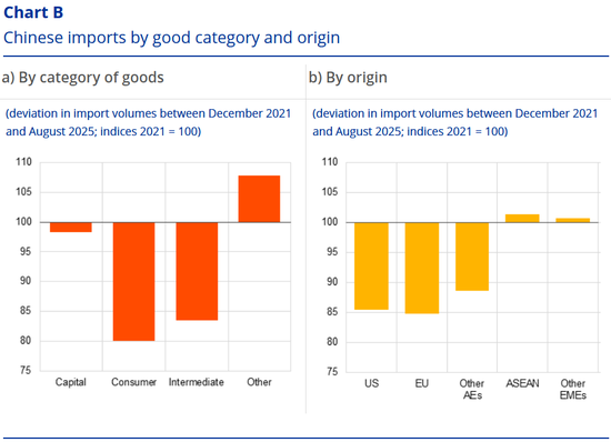 注:基于以价值和美元计价的月度名义贸易数据。“其他”包括能源商品和未分类在广义经济类别(BEC;例如车辆或军事装备)中的产品。“其他发达经济体”指其他先进经济体,“其他新兴市场经济体”指其他新兴市场经济体,“东盟”指东南亚国家联盟。最新的观察值截至2025年8月。