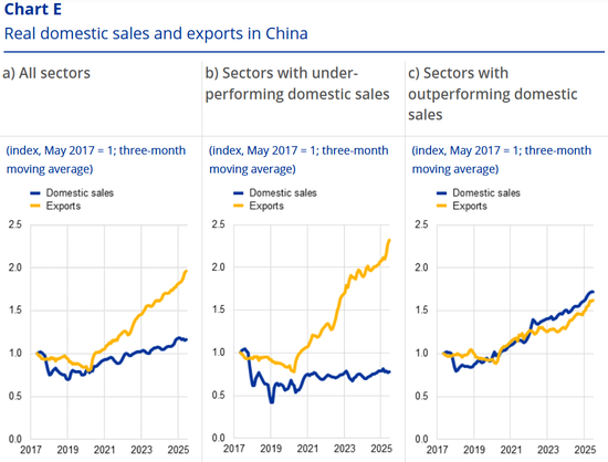 注:实际国内销售近似为名义营业收入减去出口,再按行业生产者价格指数平减。由于营业收入反映了扣除成本后的收入,该指标也捕捉了成本和盈利动态,鉴于中国行业数据限制,可作为实用的代理指标。数据涵盖了十大制造业部门,这些部门合计占2024年名义工业出口的约80%,并经过季节性调整。国内销售表现不佳定义为低于2021年后国内需求年均名义增长率6.6%的平均水平,涉及纺织品、家具、塑料和橡胶、钢铁、机械和汽车等行业。国内销售表现优异的行业涉及化学品和技术产品,包括电气机械和通信设备。2024年,国内销售表现不佳和优异的行业出口分别占名义出口总额的42%和35%。最新的观察值截至2025年6月。