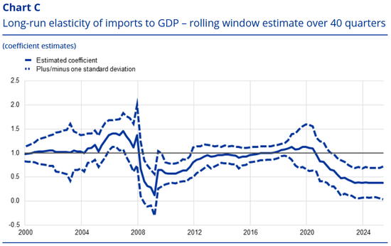 注:基于包含国内需求指数的误差修正模型的长期系数估计值,采用40个季度的滚动窗口。日期t报告的点估计对应于t-40至t期间的估计,最新的观察值截至2025年第二季度。